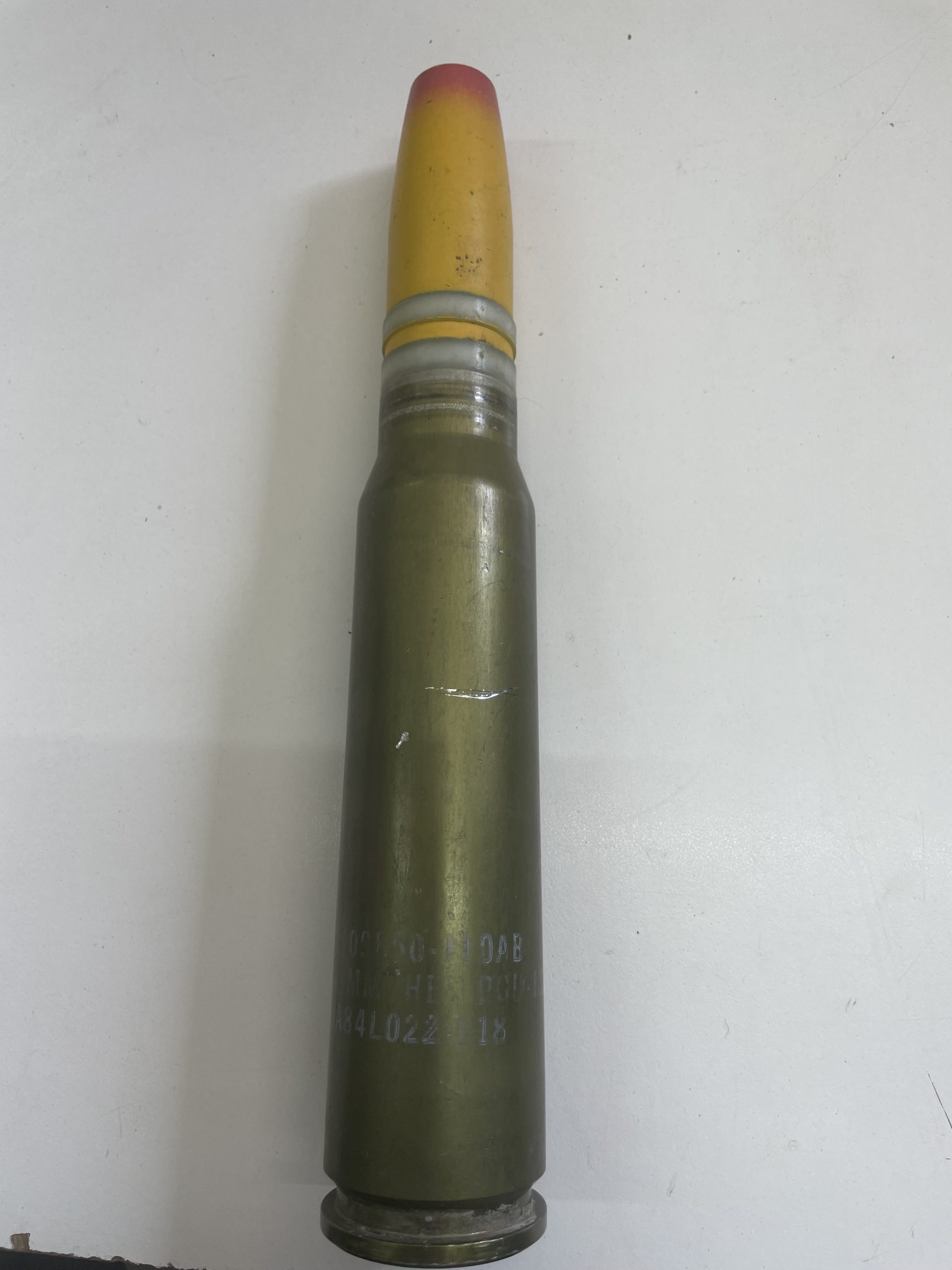 30mm inert Gau 8 HEI dummy round with fuse. The yellow part of these projectiles has been re-painted.