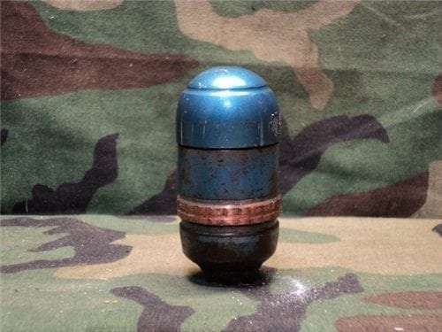 M79/203 Solid tp projectile with blue top and open base.