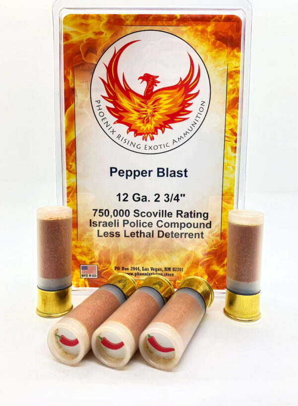The 12 Gauge 2 3/4″ Pepper Blast Round produces a cone shaped blast of OC powder approximately 8 feet in diameter at 35 feet. The agent used is the same as used by the Israeli Riot Police. It is recommended for outdoor use. It is a persistent agent with a 750,000 Scoville rating. The Pepper Blast round is a highly effective less lethal deterrent. The effects will linger if fired indoors. Its practical use is for riot control and where less than lethal force is necessary.